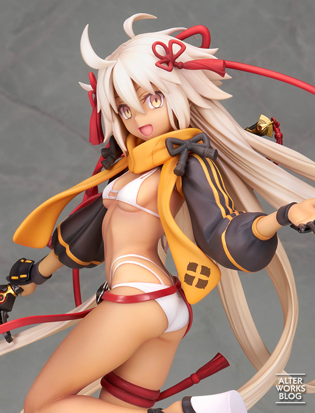 髪束や飾り紐の緩急をつけた動きが、躍動的なポーズと相まって、元気いっぱいな仕上がりです。褐色の肌に映える白い水着や、ぷにっと感のある指先、楽しむような二人の表情など見所たっぷり。それぞれの刀も緻密に再現しました。