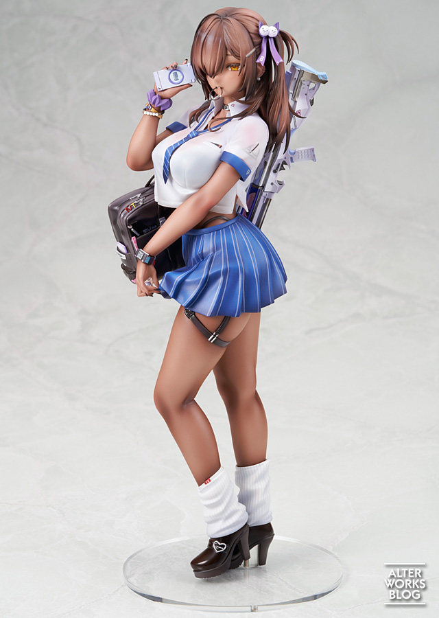 携帯を片手にすらりと立つ姿は抜群のプロポーションと相まって存在感溢れる仕上がり。スカートの端を摘む左手の繊細なニュアンスやヘアゴムを咥えた口元など、独特の情感を立体でお楽しみいただけます。塗装による衣装の透け表現をはじめ、美しい彩色も見所。各部の小物類やショットガンも造形・塗りともに精密に再現しました。