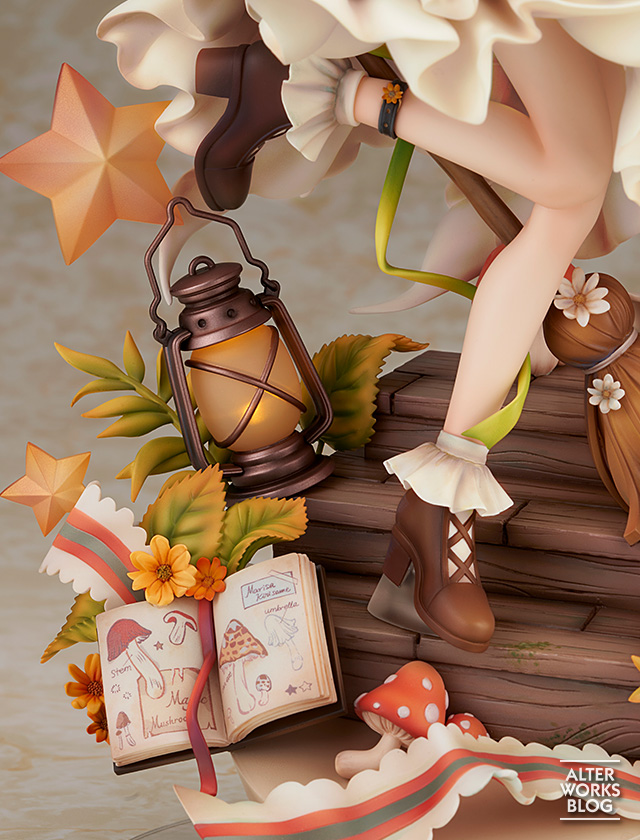 好奇心の強さを感じさせる微笑みは、元イラストの淡い色彩を丁寧に再現。台座は大輪の向日葵やキノコ、手帳などのアイテムが生き生きと彩色され目を惹く仕上がりとなりました。クリアパーツを用いた星や試験管の透明感に、フリルの柔らかな造形など、多彩な質感表現も見どころです。