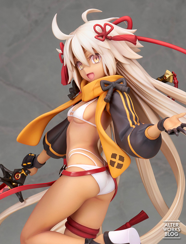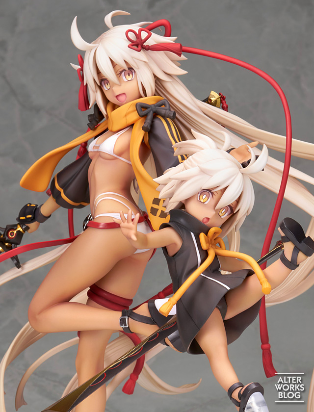 髪束や飾り紐の緩急をつけた動きが、躍動的なポーズと相まって、元気いっぱいな仕上がりです。褐色の肌に映える白い水着や、ぷにっと感のある指先、楽しむような二人の表情など見所たっぷり。それぞれの刀も緻密に再現しました。
